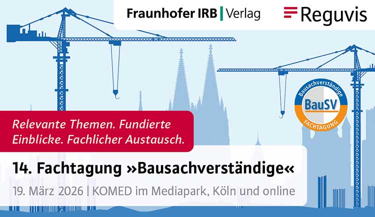 Am 19. März 2026 beleuchten hochkarätige Expertinnen und Experten aus Bautechnik und Baurecht auf der 14. Fachtagung »Bausachverständige« in Köln und online relevante Zukunftsthemen der Bausachverständigentätigkeit. Die jedes Jahr im Frühjahr stattfindende Fachtagung wird veranstaltet vom Fraunhofer-Informationszentrum Raum und Bau IRB sowie der Reguvis Akademie.